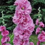 Vysoký, sloupovitý trvalý keř s jemnými růžovými květy.